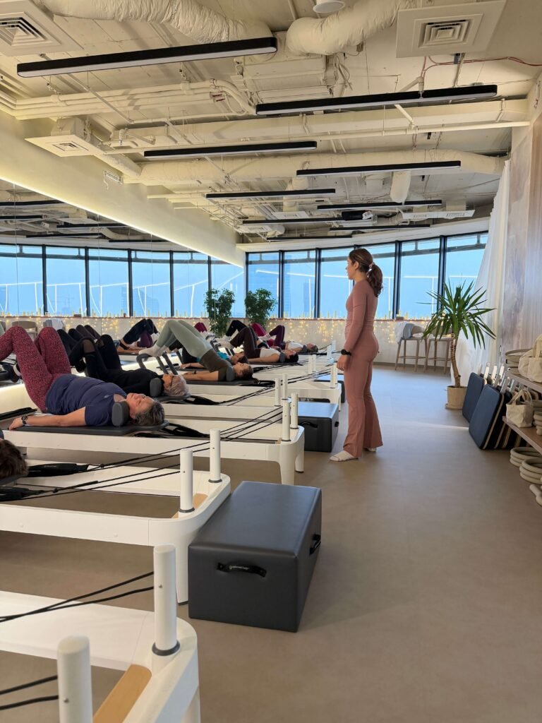 Na 24. piętrze z panoramą Warszawy ćwiczysz na reformerach Balanced Body Allegro 2 pod okiem certyfikowanych instruktorek, które dbają o technikę, precyzję i realne efekty.